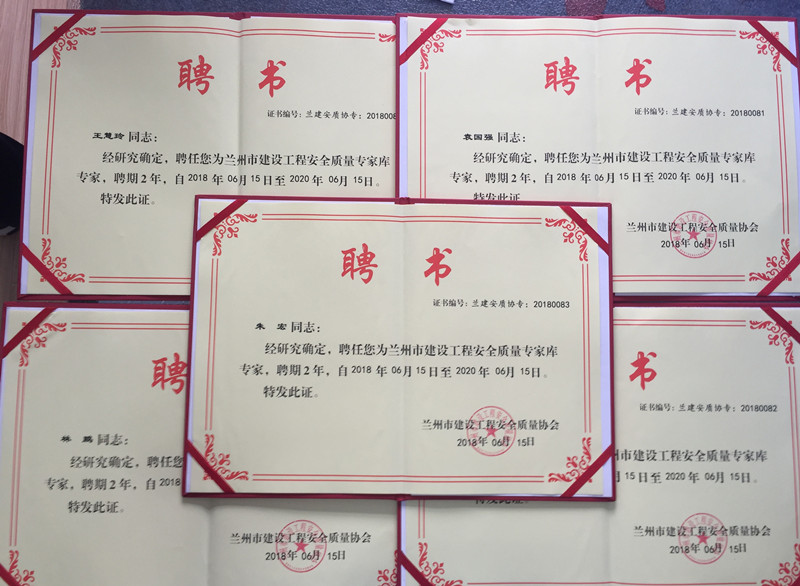 我公司于2018年4月申請(qǐng)成為蘭州市建設(shè)工程安全質(zhì)量協(xié)會(huì)會(huì)員單位。該協(xié)會(huì)為進(jìn)一步我市建設(shè)工程安全質(zhì)量管理水平,完善和規(guī)范工程安全質(zhì)量專家隊(duì)伍建設(shè),充分發(fā)揮專家在工程安全質(zhì)量檢查、咨詢、評(píng)價(jià)和指導(dǎo)等方面的作用,有效防范安全生產(chǎn)事故,更好地為企業(yè)和政府主管做好服務(wù),根據(jù)住建部37號(hào)令《危險(xiǎn)性較大的分部分項(xiàng)工程安全管理規(guī)定》我公司呂永平、朱宏、王惠玲、林鵬、袁國(guó)強(qiáng)被聘任為蘭州市建設(shè)工程安全質(zhì)量專家?guī)鞂<摇?/span>