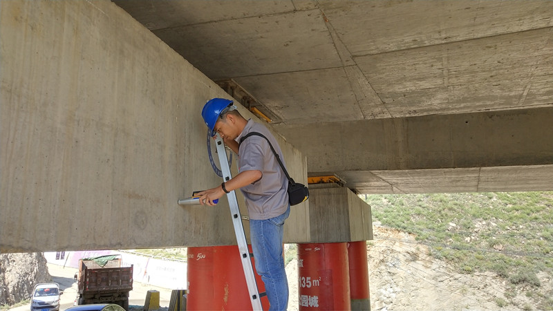 該項目現(xiàn)場檢測工作于2018年8月15日開始,8月23日結(jié)束,現(xiàn)場檢測工作由王艷森負責,參加人員有李超、劉強等。主要檢測內(nèi)容有路面彎沉檢測、路面鉆芯檢測、高程測量,對墩柱、承臺、預制梁、蓋梁、現(xiàn)澆梁板的混凝土強度及保護層厚度檢測以及混凝土試塊、鋼筋及連接件、防水材料、壓漿料等原材料檢測。