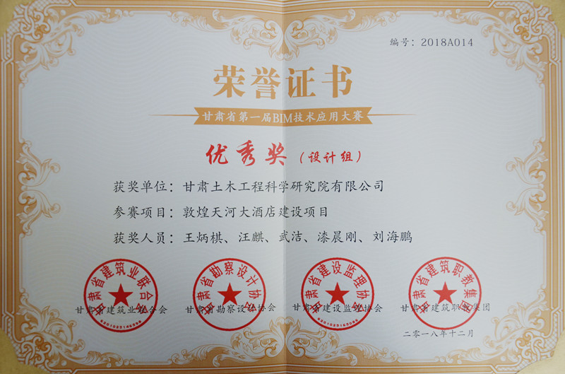 由甘肅省建筑業(yè)聯(lián)合會(huì)、甘肅省勘察設(shè)計(jì)協(xié)會(huì)、甘肅省建設(shè)監(jiān)理協(xié)會(huì)、甘肅省建筑職教集團(tuán)主辦的甘肅省第一屆BIM技術(shù)應(yīng)用大賽頒獎(jiǎng)典禮于近日舉行,由我公司建筑設(shè)計(jì)中心王炳棋、汪麒、武潔、漆晨剛、劉海鵬幾位專業(yè)技術(shù)人員負(fù)責(zé)的“敦煌天和大酒店建設(shè)項(xiàng)目”BIM技術(shù)優(yōu)化設(shè)計(jì)獲得設(shè)計(jì)組優(yōu)秀獎(jiǎng)。