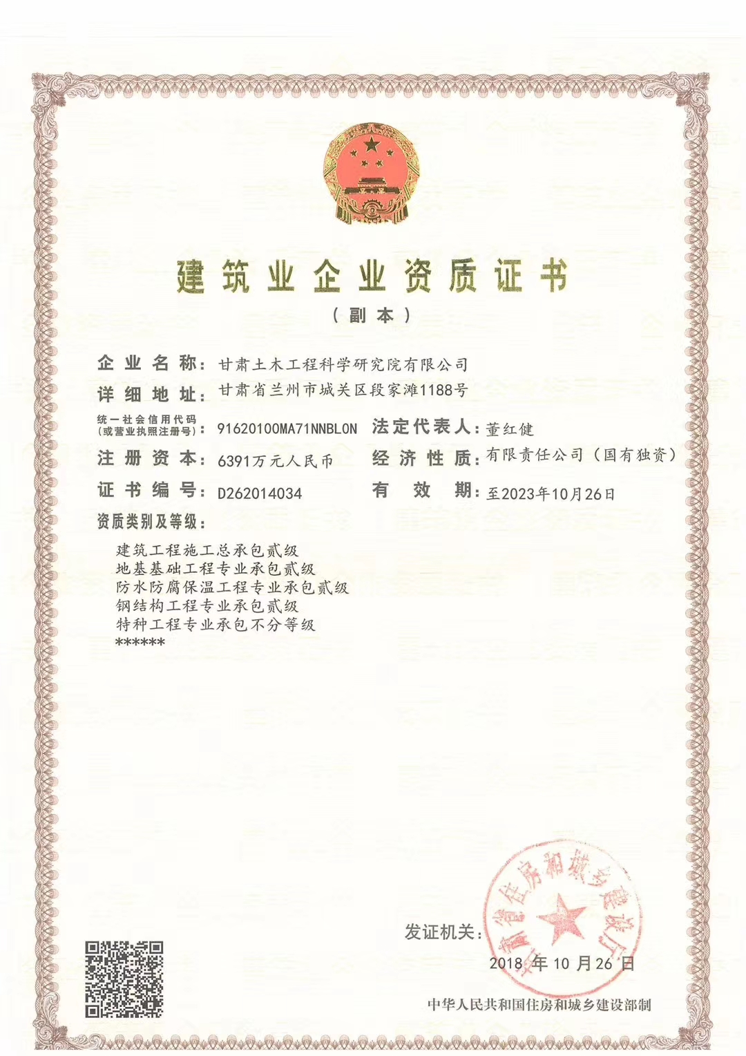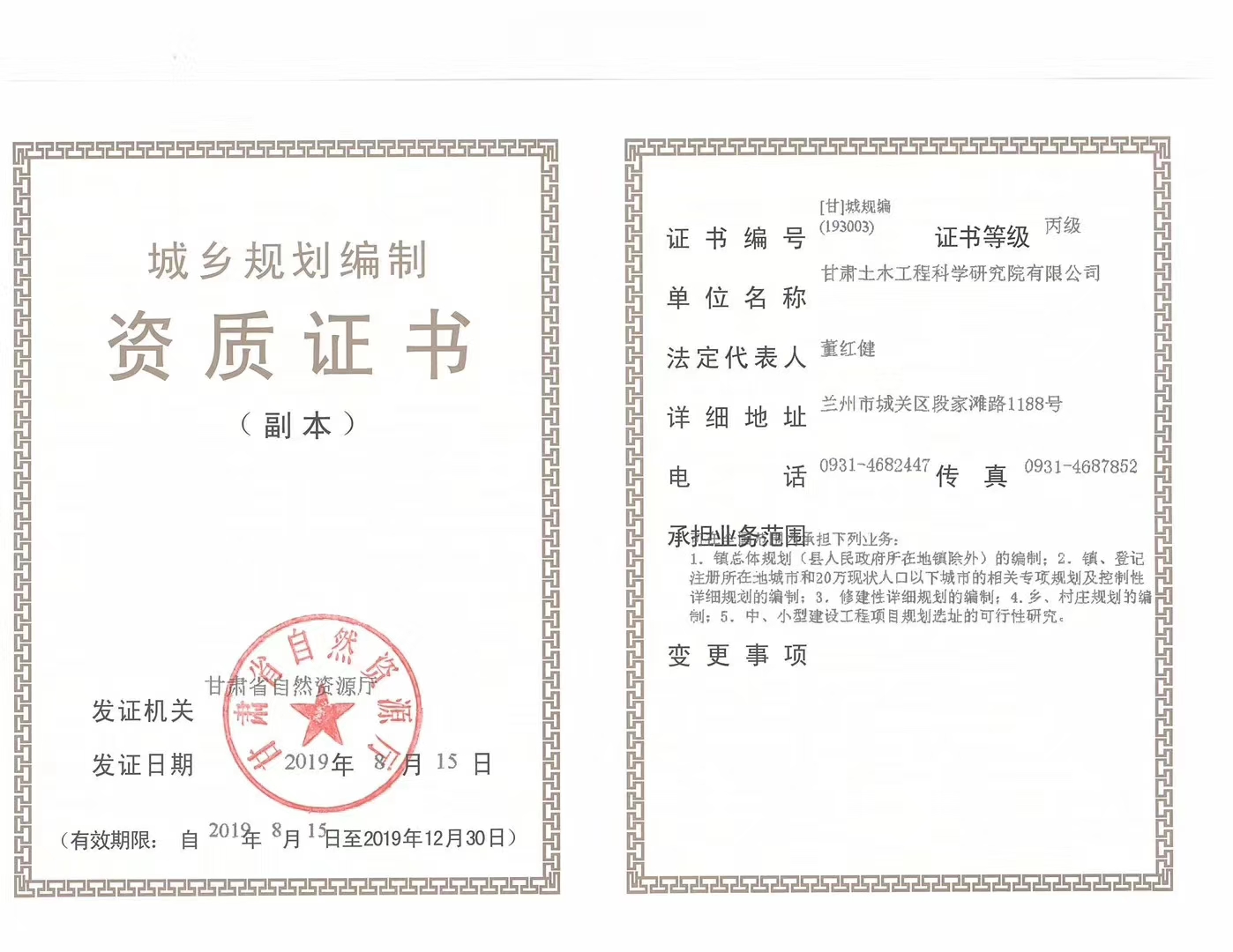 近日,公司建筑工程施工總承包貳級資質(zhì)和城鄉(xiāng)規(guī)劃丙級資質(zhì)獲甘肅省住房和城鄉(xiāng)建設(shè)廳和甘肅省自然資源廳批準(zhǔn),標(biāo)志著公司資質(zhì)建設(shè)取得重大進展。