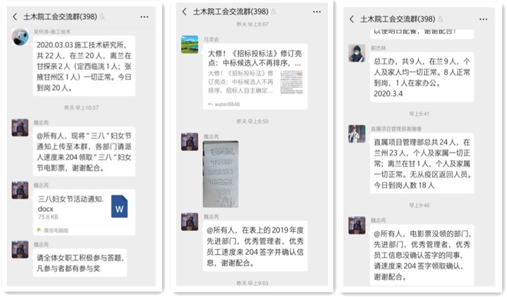 依托微信平臺,加強對公司日常工作管理、信息發(fā)布、疫情發(fā)展趨勢、職工人員信息進行收集管理,做好日常管理、防控、監(jiān)督、宣傳工作。
