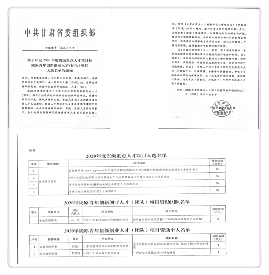 近日,中共甘肅省委組織部印發(fā)通知,公布了2020年度省級重點人才項目和隴原青年創(chuàng)新創(chuàng)業(yè)人才(團隊)項目入選名單。我公司蘇富赟同志申報的“一種新型高性能復(fù)合材料的研制”項目成功入選甘肅隴原青年創(chuàng)新創(chuàng)業(yè)人才(團隊)項目并獲得資助。