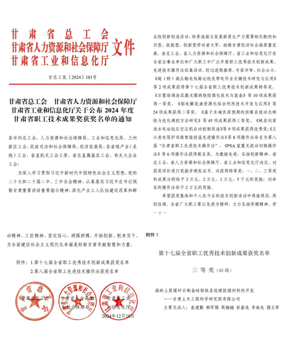 近日,甘肅省總工會、甘肅省人力資源和社會保障廳、甘肅省工業(yè)和信息化廳公布了2024年度甘肅省職工技術(shù)成果獎獲獎名單,公司材料科學(xué)與工程研究院崔建勤等同志完成的《高嶺土質(zhì)煤矸石制備硅鋁體系低碳膠凝材料的開發(fā)》榮獲第十七屆全省職工優(yōu)秀技術(shù)創(chuàng)新成果三等獎。