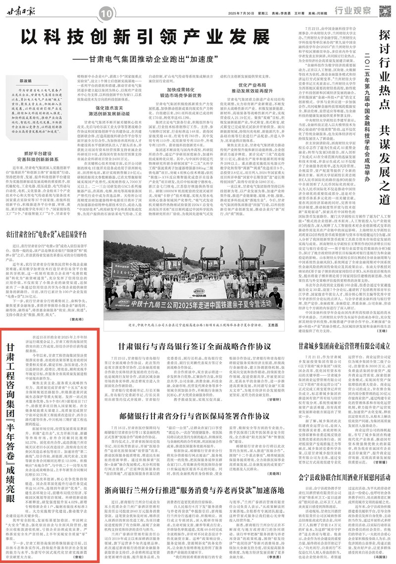 拓展市場空間,經(jīng)營發(fā)展質(zhì)效顯著躍升。積極“走出去”,大力開拓川渝、新疆等外埠市場,省外合同額同比激增92.37%。深化省內(nèi)合作,成功落地蘭州市城關(guān)區(qū)老舊小區(qū)改造設(shè)計(jì)、敦煌南倉歷史街區(qū)改造總承包等項(xiàng)目。加速培育“第二曲線”,綜合咨詢、新能源、現(xiàn)代農(nóng)業(yè)、文旅等新業(yè)務(wù)合同額同比增長12.03%。積極響應(yīng)“央地合作”,與中鐵二十一局等大型央企達(dá)成戰(zhàn)略協(xié)議,上半年新簽合同額同比增長33.77%。