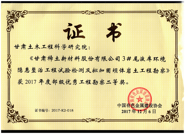 1.獲2017中國有色金屬建設協(xié)會部級優(yōu)秀工程勘察二等獎;