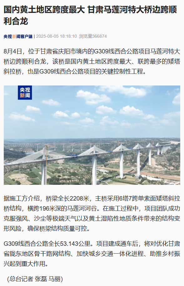 近日,由甘肅工程咨詢集團旗下省交通監(jiān)理公司承監(jiān)的G309線西合公路項目建設取得重大進展——馬蓮河特大橋邊跨順利合龍。項目建成后,將進一步完善區(qū)域路網(wǎng)結(jié)構(gòu),對促進慶陽地區(qū)經(jīng)濟社會發(fā)展具有重要意義。