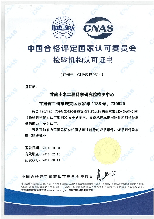 2012年2月首次依據(jù)CNAS-CL01建立了檢驗機構(gòu)質(zhì)量管理體系,2012年8月初次通過國家檢驗機構(gòu)認可,檢驗領(lǐng)域為建筑地基(地基、樁基承載力試驗與評價)、建筑結(jié)構(gòu)(工程施工質(zhì)量評價、結(jié)構(gòu)設(shè)計復(fù)核、結(jié)構(gòu)抗震性能評價、結(jié)構(gòu)安全性與可靠性評價)、建筑節(jié)能(圍護結(jié)構(gòu)節(jié)能性能施工質(zhì)量及評價、建筑物能耗及節(jié)能綜合指標評價)、混凝土(混凝土配合比質(zhì)量評定、混凝土質(zhì)量和生產(chǎn)過程質(zhì)量控制評定)。歷經(jīng)監(jiān)督檢查,換證復(fù)評審,持續(xù)有效運行5年。